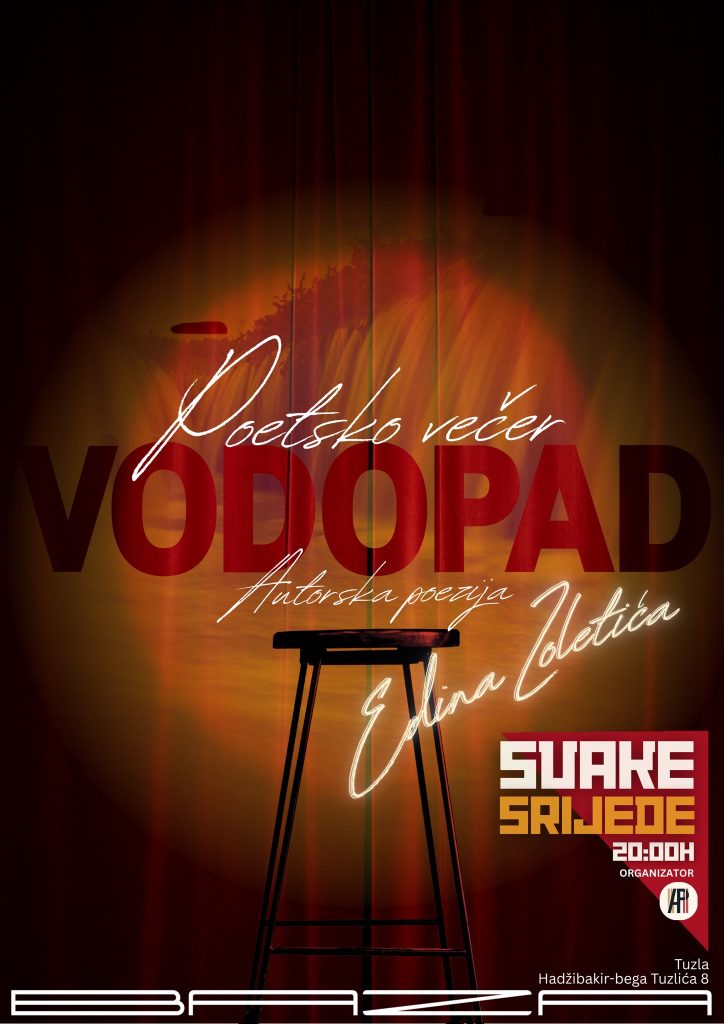 U prvom planu će biti poetska večer „Vodopad” gdje će Edin Zoletić čitati i razgovarati o svojoj autorskoj poeziji. U isto vrijeme, nekoliko koraka dalje, oni koji više vole stvarati rukama mogu se uključiti u Paint & Sip radionicu pod vodstvom Mirsada Hadžiefendića. Ambijent je namjerno zamišljen miran i opušten, da svako može raditi svojim tempom, uz pribor koji ćemo mi obezbijediti i izbor pića koji će biti na raspolaganju. Prva radionica je BESPLATNA, ali se treba prijaviti ranije kako bismo znali koliko materijala pripremiti.
