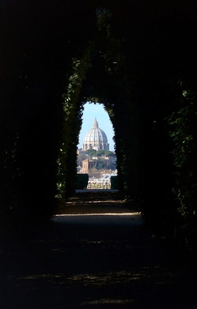 Kroz tu tačku pogleda u daljini se savršeno poravnava panorama koja obuhvata uređen vrt, italijanski prostor i kupolu Bazilike svetog Petra u Vatikanu. Upravo ta precizna vizuelna linija čini ovo mjesto posebnim i nezaboravnim.